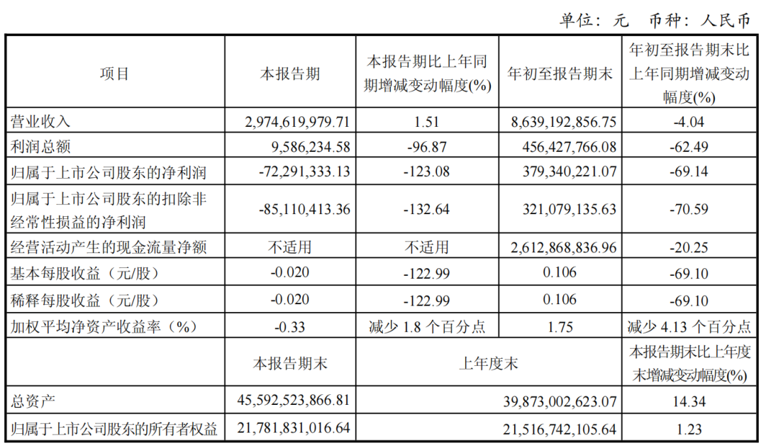 从营收和利润方面看,公司本报告期实现营业总收入86.39亿元,同比下降4.04%,净利润3.79亿元,同比下降69.14%,基本每股收益为0.11元。